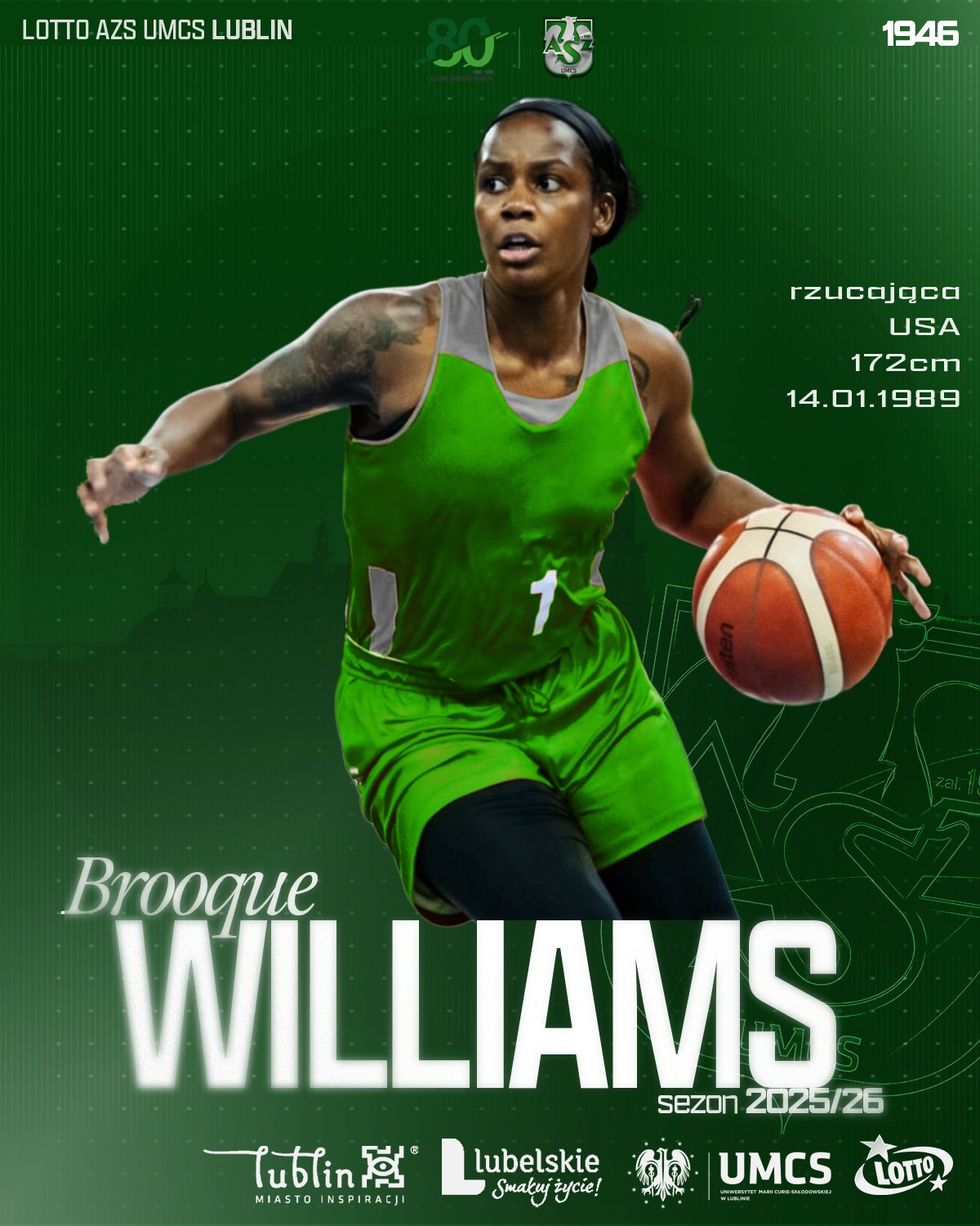 Do zespołu Biało-Zielonych dołącza Brooque Williams! Urodzona w Pittsburgu Amerykanka to doświadczona zawodniczka grająca przede wszystkim na pozycji numer 2. W swojej długiej karierze rywalizowała w topowych europejskich ligach m.in. tureckiej, hiszpańskiej, czy włoskiej.